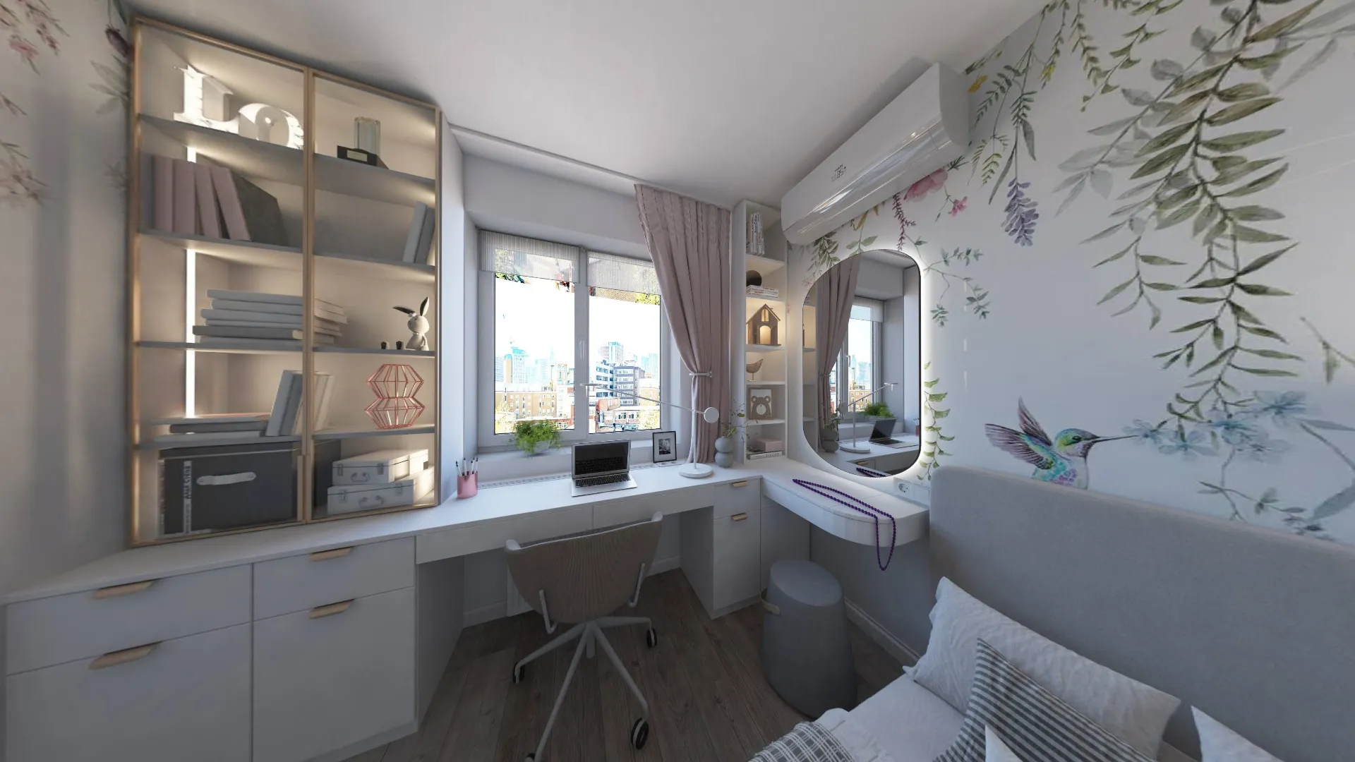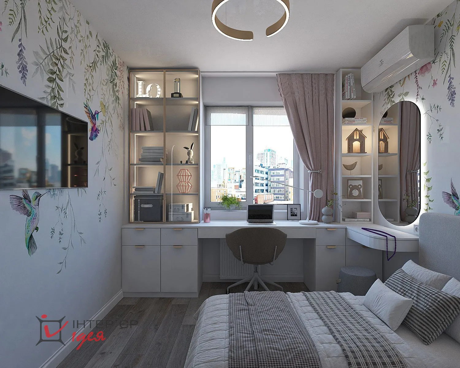 Основным оттенком выбран белый, который расширяет пространство и наполняет его светом. Акцентом стали обои с цветами и птицами — они вносят в интерьер деликатные краски и создают настроение лёгкости.