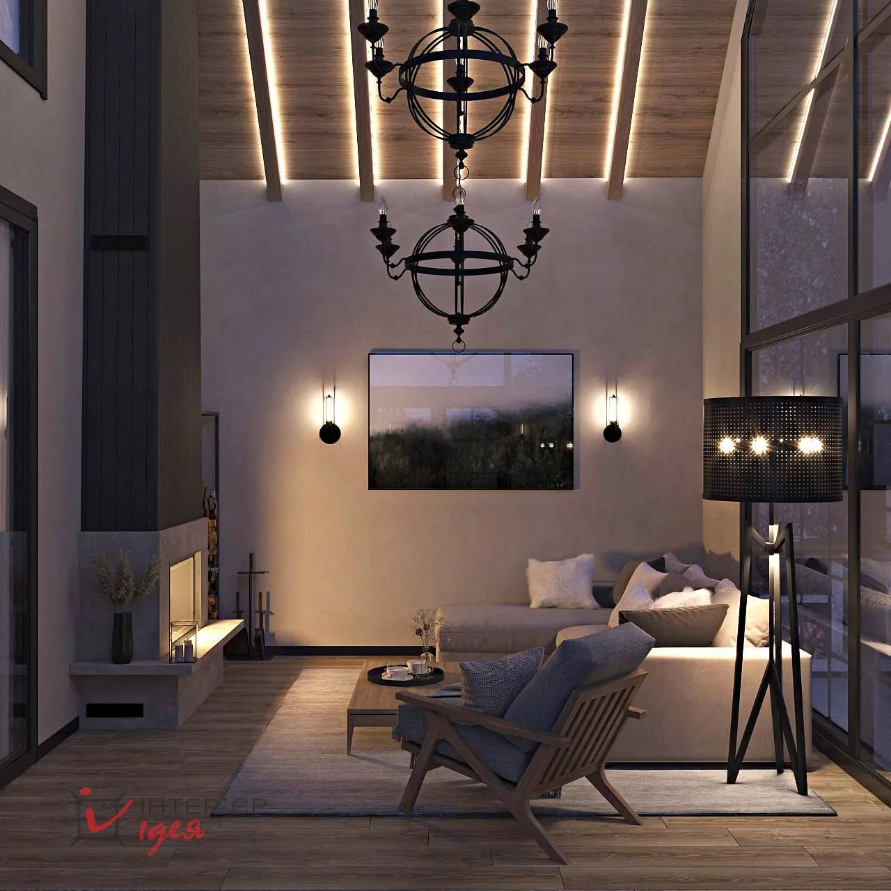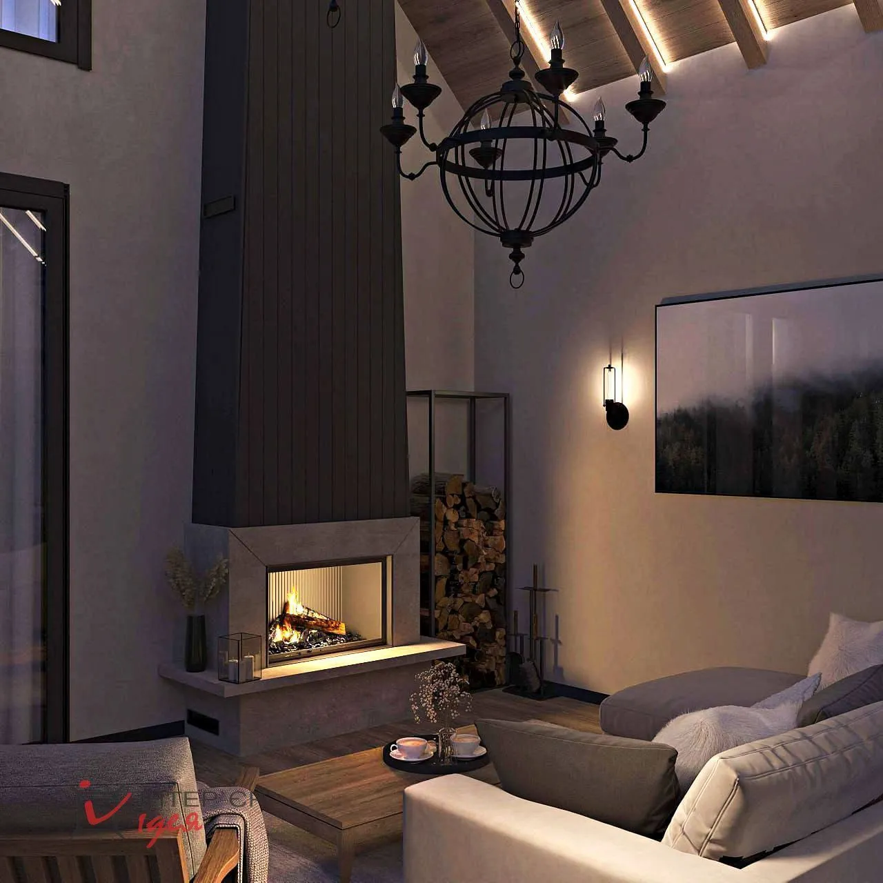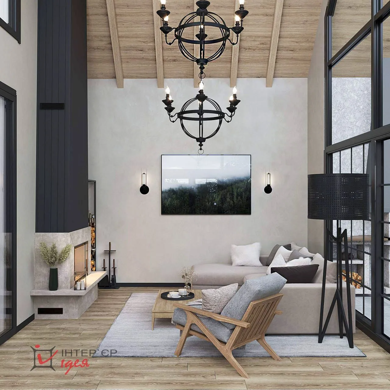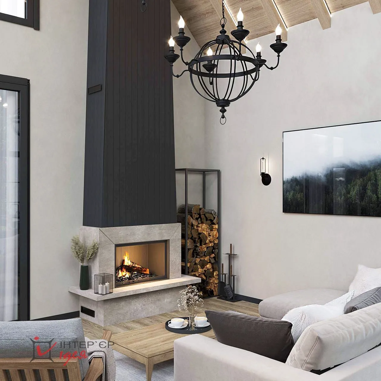В каминной комнате мы разместим большой угловой удобный диван, кресло и журнальный столик. На стенах - декоративная штукатурка. Камин отделан керамогранитом и крашеным деревом. Потолок подбит деревом, украшен балками и светодиодными подсветками. Также на потолке расположены две большие кованые люстры, которые придают комнате шарм. На полу уложен керамогранит.