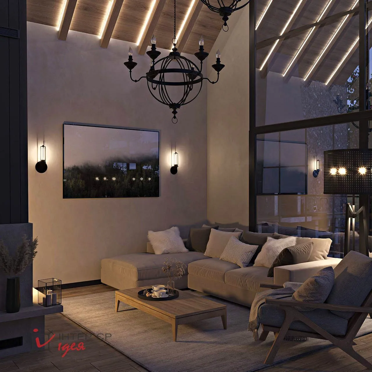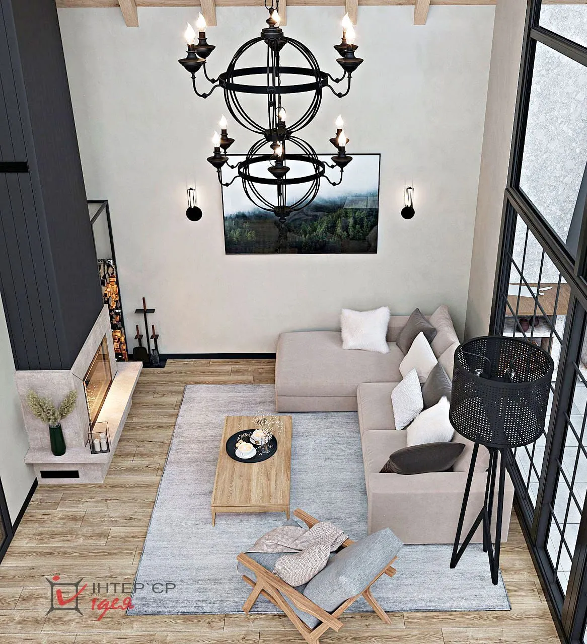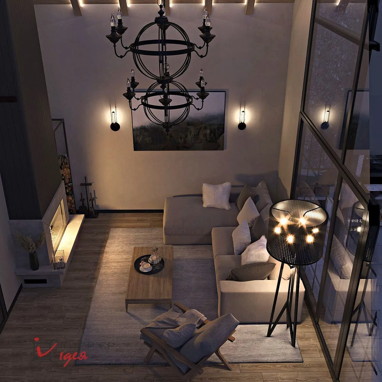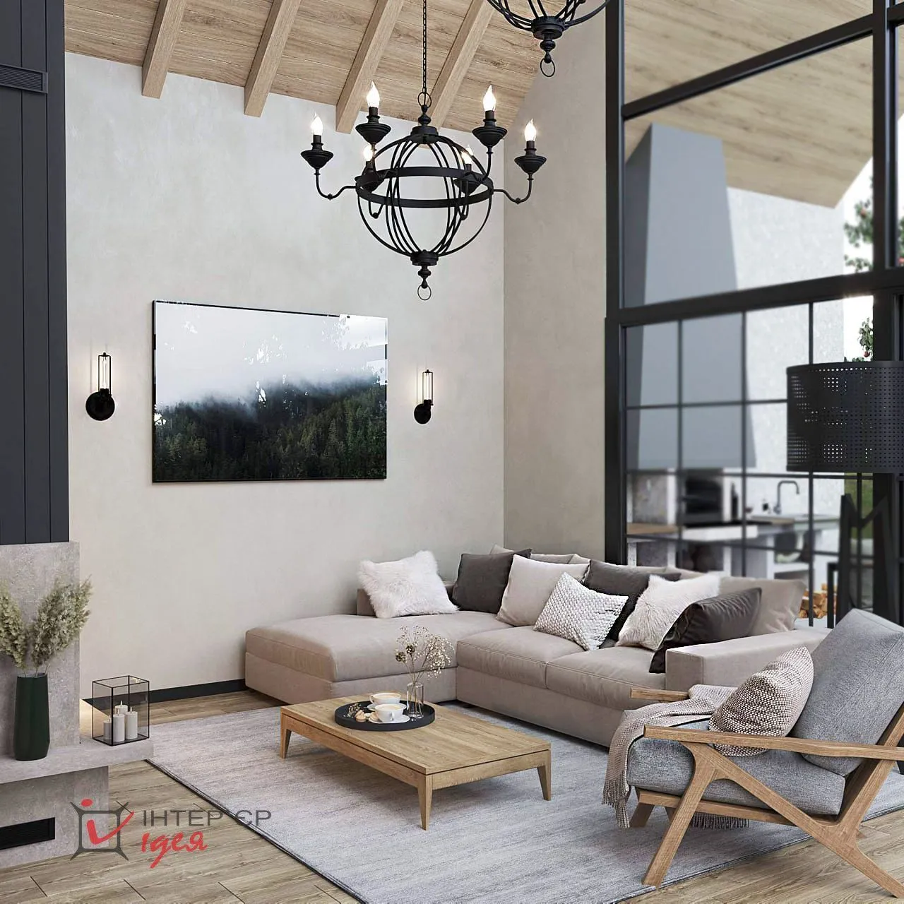В каминной комнате мы разместим большой угловой удобный диван, кресло и журнальный столик. На стенах - декоративная штукатурка. Камин отделан керамогранитом и крашеным деревом. Потолок подбит деревом, украшен балками и светодиодными подсветками. Также на потолке расположены две большие кованые люстры, которые придают комнате шарм. На полу уложен керамогранит.
