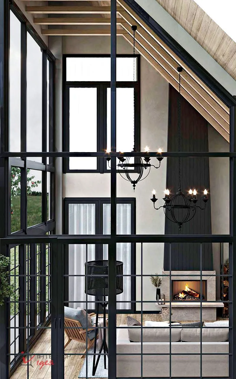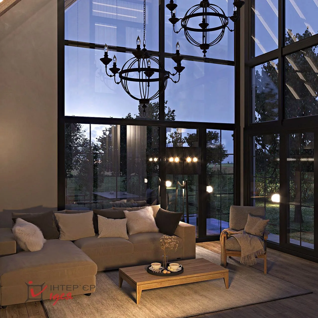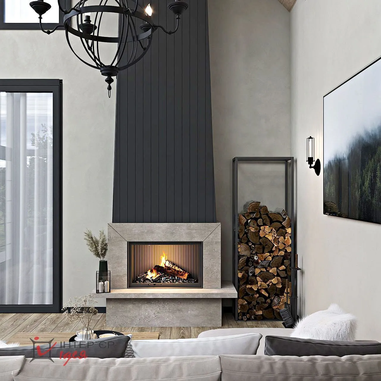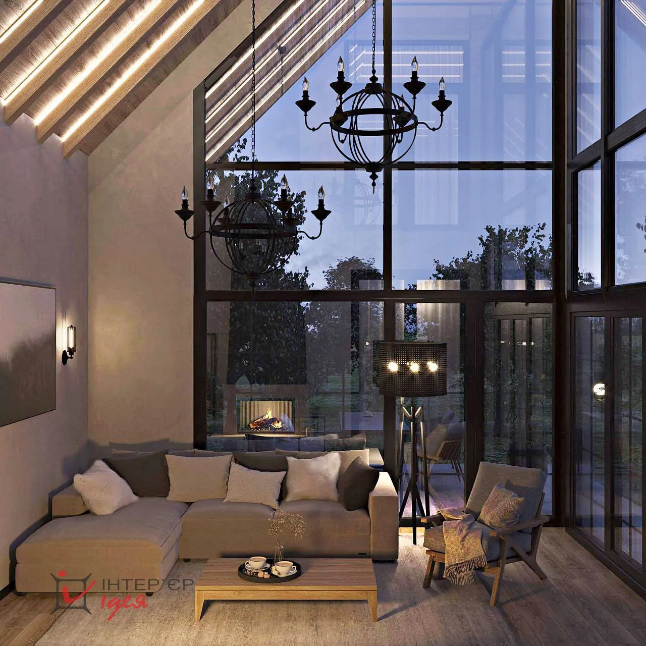 В каминной комнате мы разместим большой угловой удобный диван, кресло и журнальный столик. На стенах - декоративная штукатурка. Камин отделан керамогранитом и крашеным деревом. Потолок подбит деревом, украшен балками и светодиодными подсветками. Также на потолке расположены две большие кованые люстры, которые придают комнате шарм. На полу уложен керамогранит.
