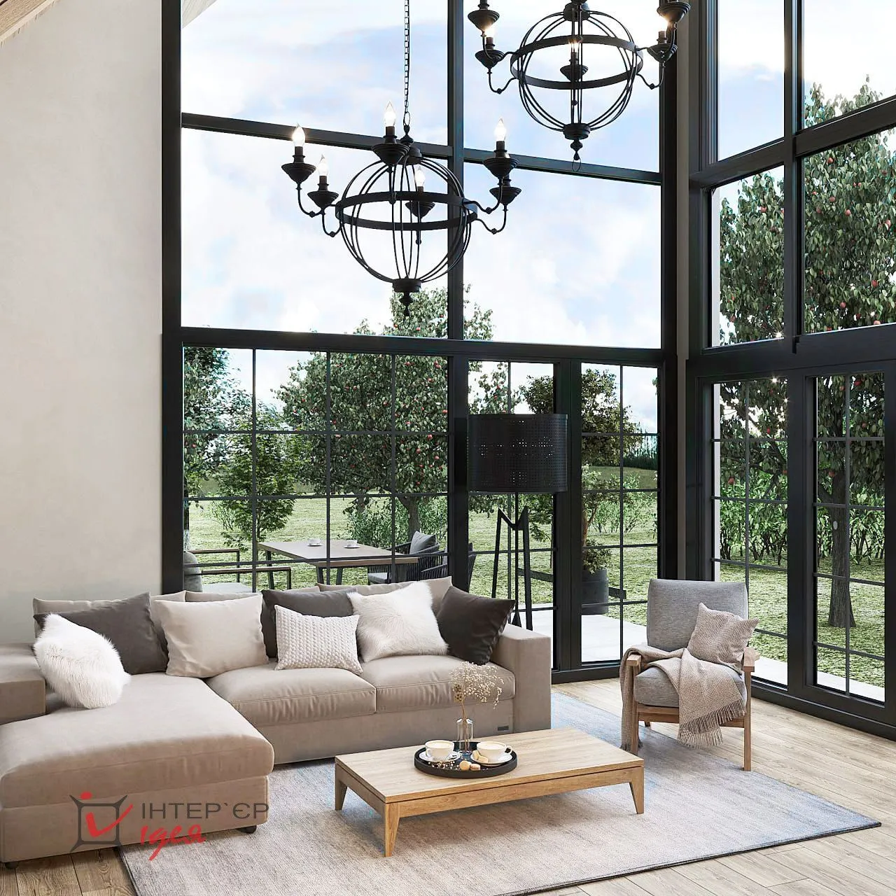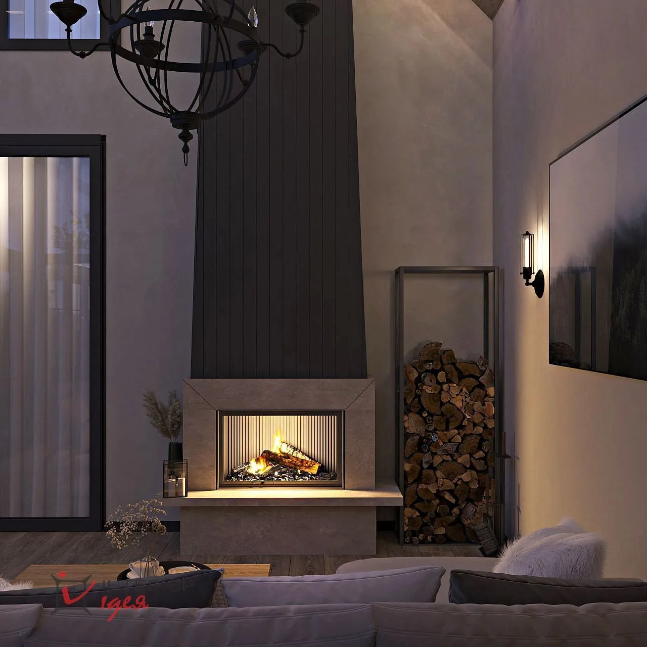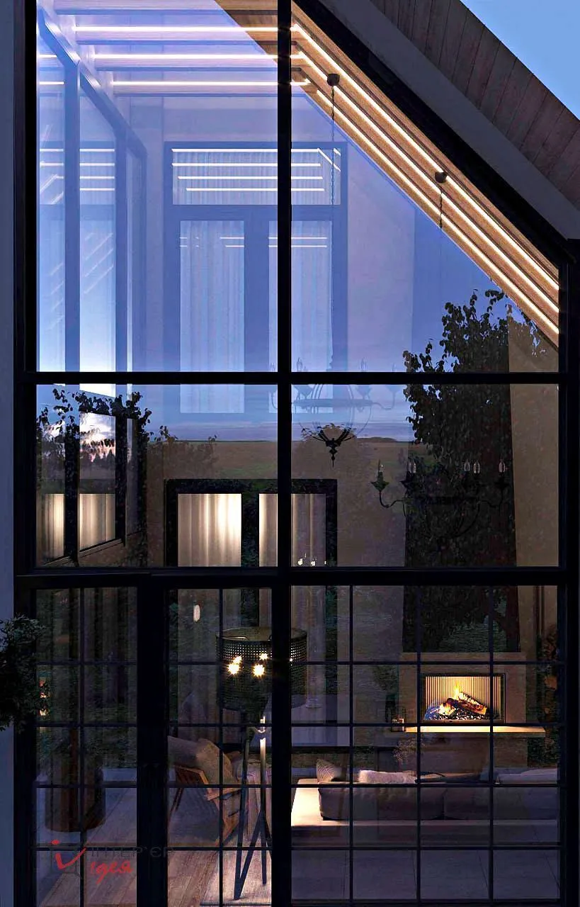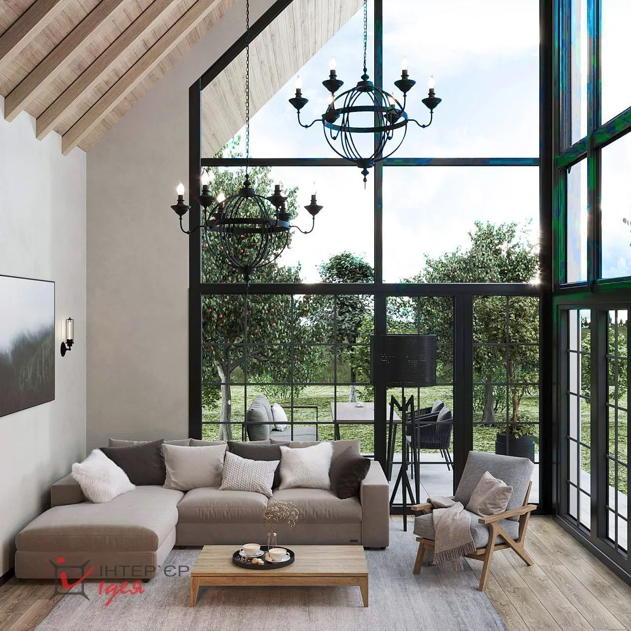 В каминной комнате мы разместим большой угловой удобный диван, кресло и журнальный столик. На стенах - декоративная штукатурка. Камин отделан керамогранитом и крашеным деревом. Потолок подбит деревом, украшен балками и светодиодными подсветками. Также на потолке расположены две большие кованые люстры, которые придают комнате шарм. На полу уложен керамогранит.