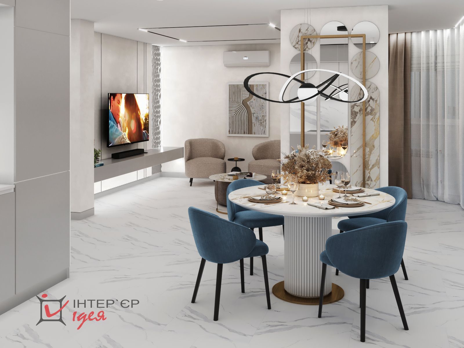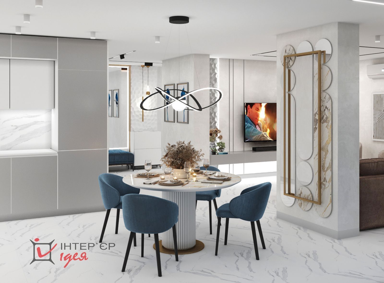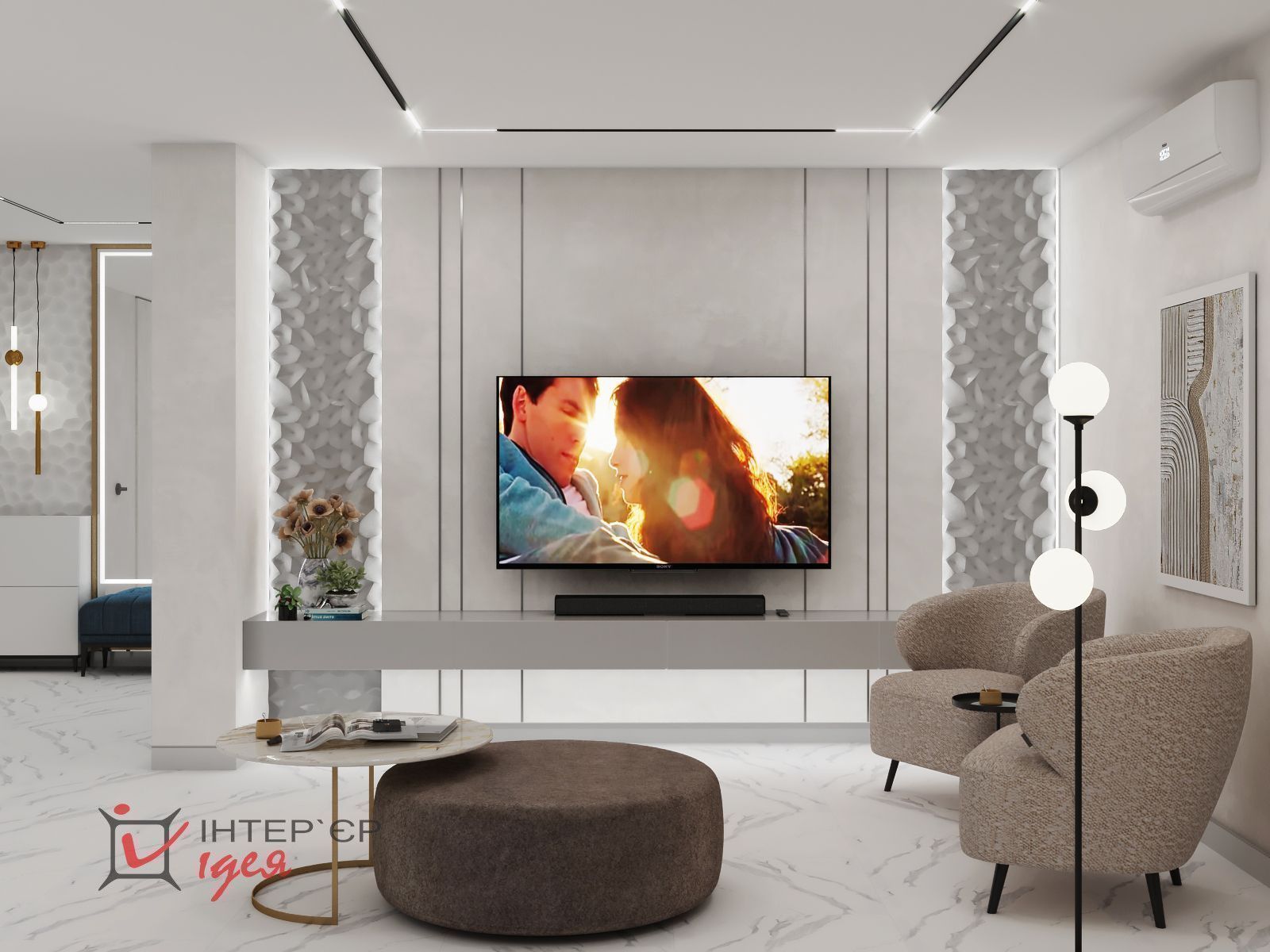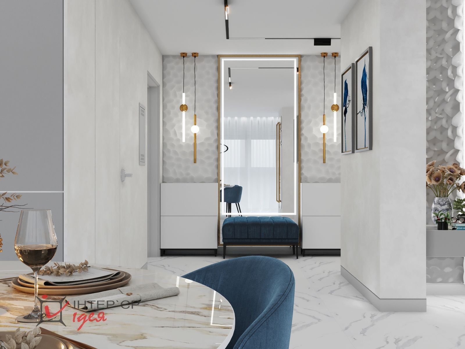 Разнообразие использованных текстур делают пространство визуально интересным и заполненным.