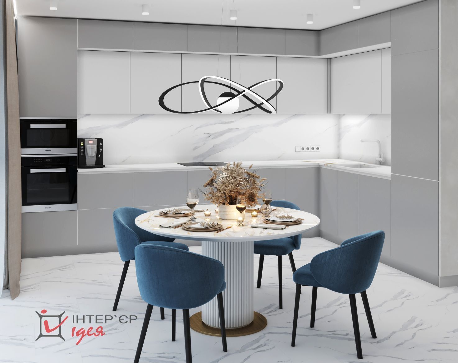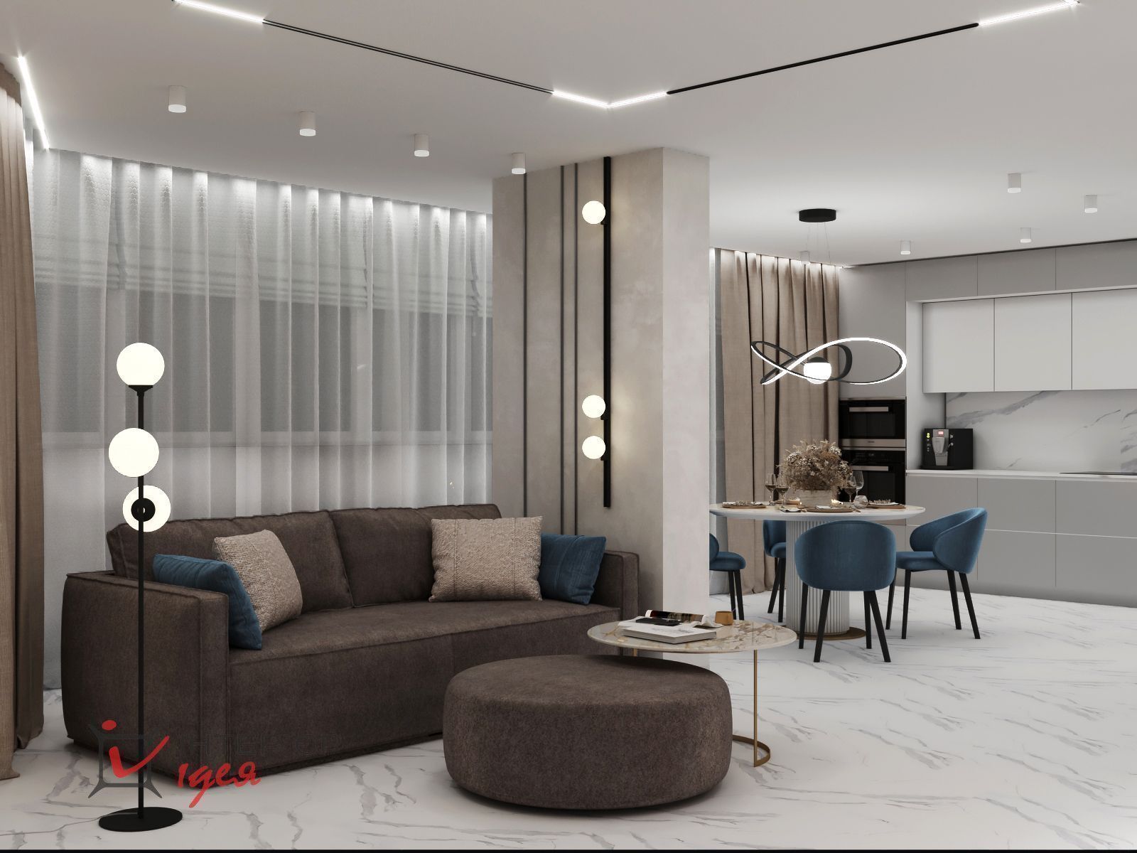 Пожеланием заказчика было обеспечить яркое освещение помещения в темное время. Поэтому в кухне-студии предусмотрены всевозможные светильники, которые можно включать в разных комбинациях.