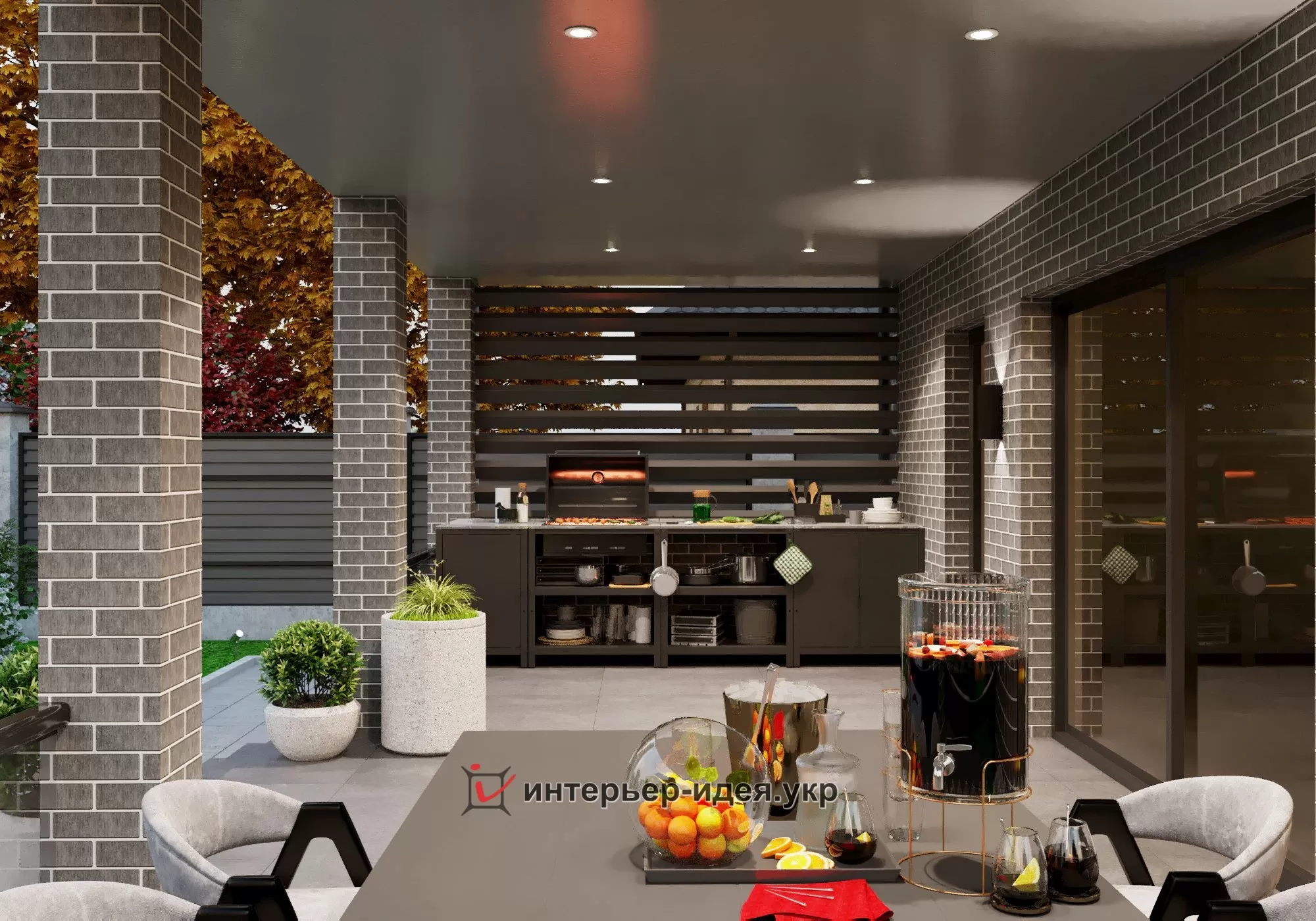 С помощью кирпича мы визуально выделили входную зону здания и зону террасы с перголой.