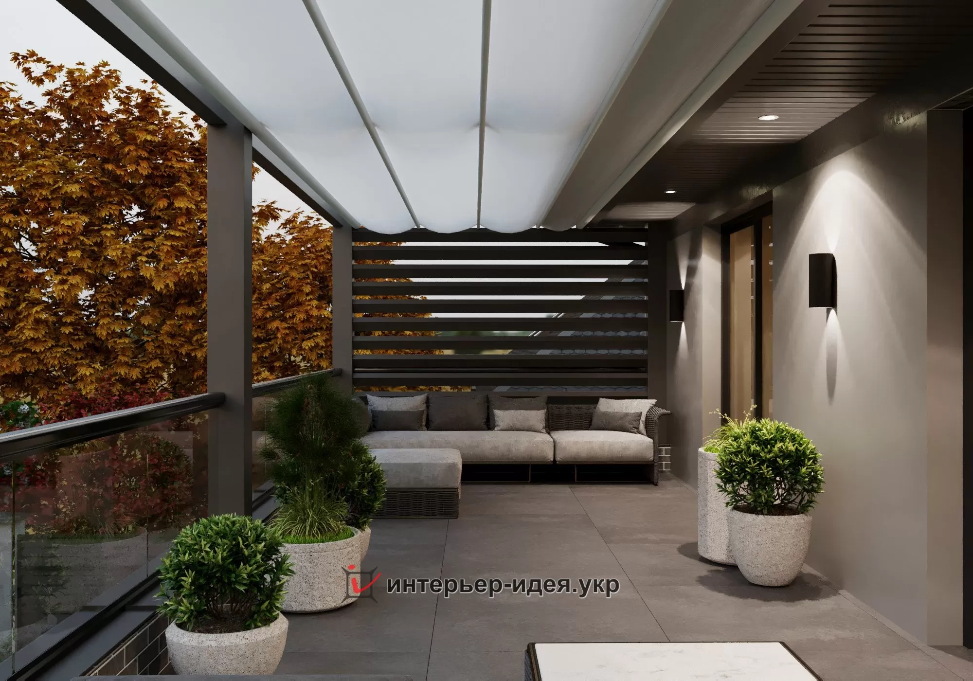 Напольное покрытие террасы - широкоформатный керамогранит.